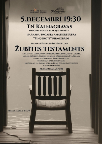 5. decembris 19:30 - 20:40; Tautas nams "Kalnagravas"; SarkaņiAmatierteātra “Piņģerots” aicina uz Marikas Pudules - Indānes lugu "Žubītes testaments" Kalnagravās.