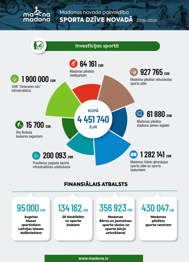 Ikdienas steigā daudzām vietām un lietām paskrienam garām, tās nepamanot. Padarītie darbi un ieguldītie līdzekļi piemirstas. Tas ir tikai cilvēcīgi. Taču reizēm mums visiem ir vērtīgi atskatīties uz paveikto.Turpmākajos mēnešos ar viegli uztveramu infografiku palīdzību atspoguļosim informāciju par Madonas novada pašvaldībā pēdējos gados īstenotajām aktivitātēm, veiktajiem ieguldījumiem un pieejamajiem pakalpojumiem dažādās jomās. Šo to no apkopotā Tu jau zināsi, bet daži fakti iespējams būs jaunums un pat noderīga informācija.8. INFOGRAFIKA - SPORTA DZĪVE Madonas novadā - PDF failā.Informāciju sagatavoja: Attīstības nodaļa