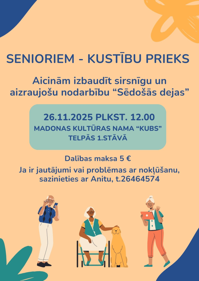 Kustība ir svarīga jebkurā vecumā, savukārt dejas rada prieku, tāpēc aicinām seniorus uz nodarbību, kas apvienos abus. Sēdošās dejas ir deju veids, kur kustības tiek veiktas galvenokārt sēžot, profesionāla pasniedzēja vadībā. Sēdošās dejas palīdz uzturēt muskuļu tonusu un locītavu kustīgumu, veicināt asinsriti un elpošanu, uzlabot līdzsvaru un koordināciju. Vienkārši sakot – tās ir dejas, kas ļauj kustēties un izbaudīt mūziku pat tad, ja stāvēt vai aktīvi dejot nav iespējams.