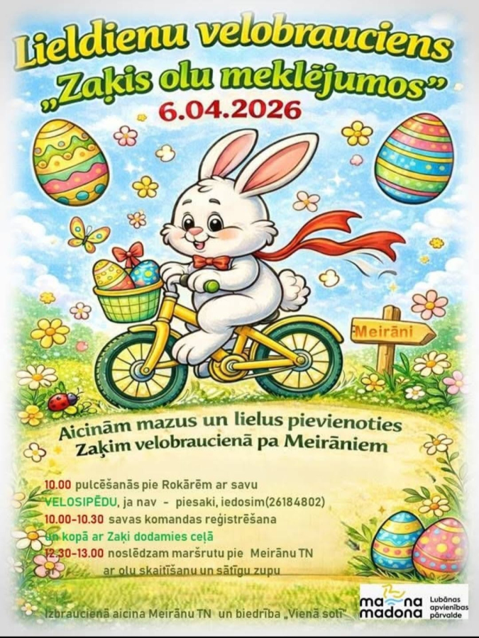 6. aprīlī biedrība" Vienā solī" sadarbībā ar Meirānu tautas namu aicina uz lieldienu aktivitātēm, pievienoties velo braucienam, zaķim olu meklēšanā pa Meirāniem.