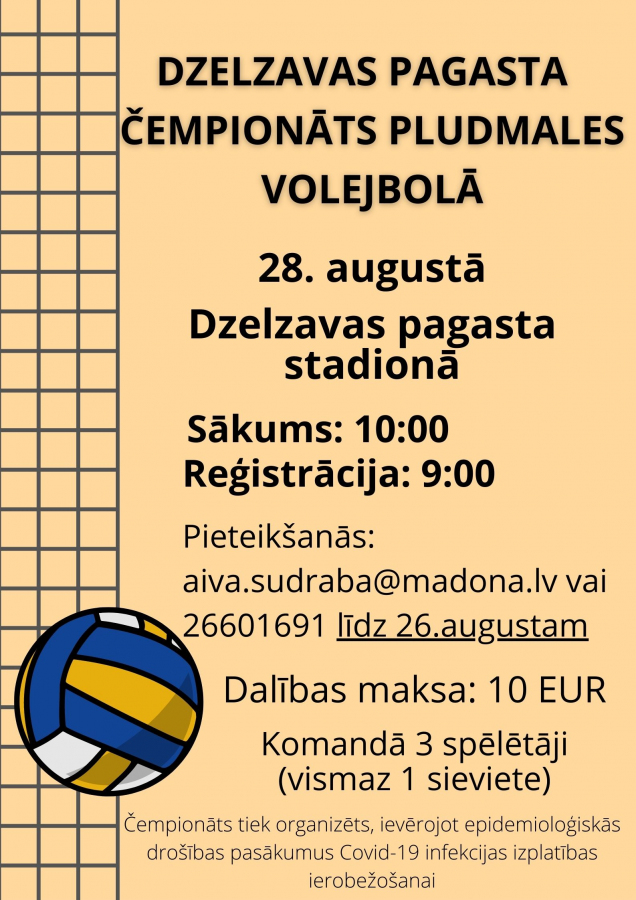Dzelzavas pagasta čempionāts pludmales volejbolā notiks Dzelzavas pagasta stadionā 28. augustā plkst.10.00.