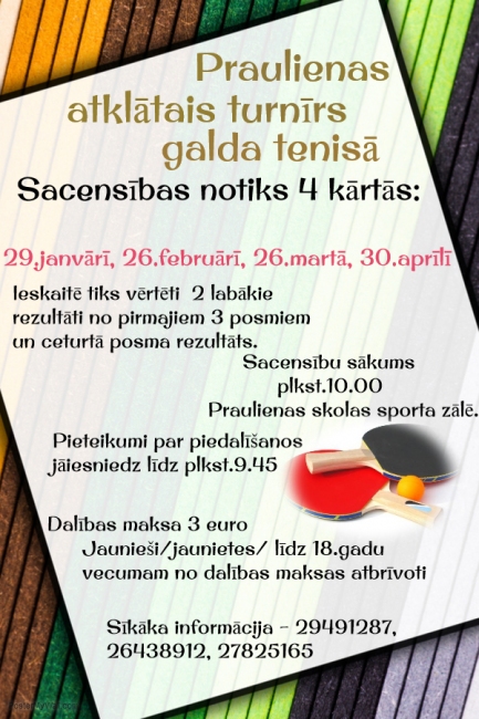 Sacensību sākums pl.10.00 Praulienas skolas sporta zālē.