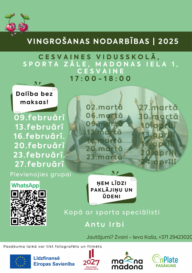 Nodarbības notiks regulāri pirmdienās un piektdienās plkst. 17:00-18:00, Cesvaines vidusskolas sporta zālē, Madonas ielā 1, Cesvainē, Madonas novads!