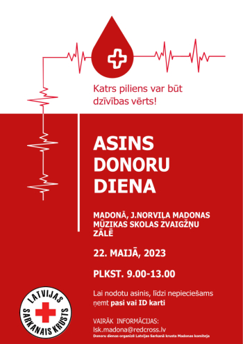 Valsts asinsdonoru centrs (VADC) rīkos Donoru dienas izbraukumu J. Norviļa Madonas mūzikas skolā, Blaumaņa ielā 16, Madonā, 25. aprīlī no plkst. 09:00 līdz 13:00.