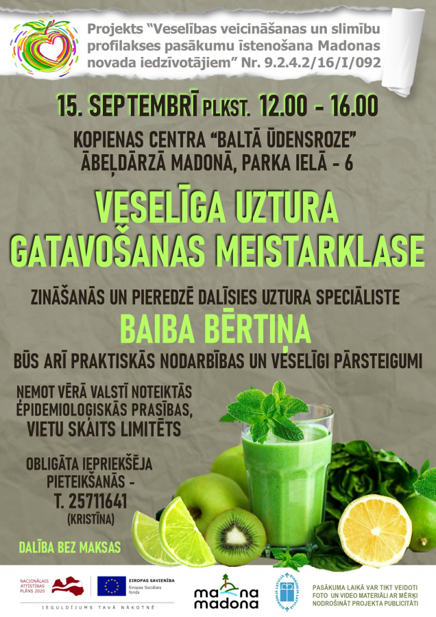Projekta “Veselības veicināšanas un slimību profilakses pasākumu īstenošana Madonas novada iedzīvotājiem” Nr. 9.2.4.2/16/I/092 ietvaros Madonā tiek piedāvāta veselīga uztura meistarklases profesionāla pārtikas tehnologa vadībā.