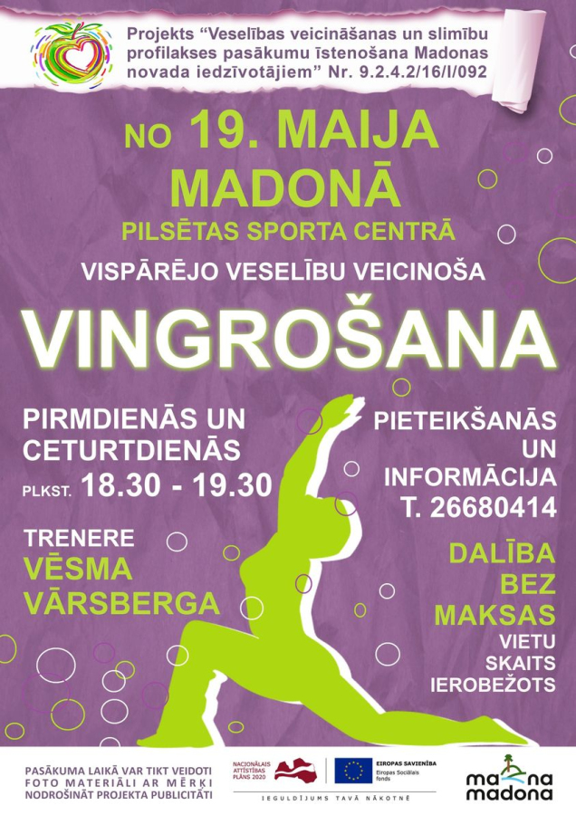 Projekta “Veselības veicināšanas un slimību profilakses pasākumu īstenošana Madonas novada iedzīvotājiem Nr. 9.2.4.2/16/I/092” ietvaros tiek uzsāktas jaunas veselību veicinošas vingrošanas nodarbības madoniešiem.