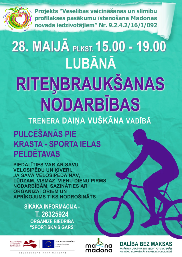 Projekta “Veselības veicināšanas un slimību profilakses pasākumu īstenošana Madonas novada iedzīvotājiem Nr. 9.2.4.2/16/I/092” ietvaros tiek piedāvātas veselību veicinošas riteņbraukšanas nodarbības Lubānas iedzīvotājiem.