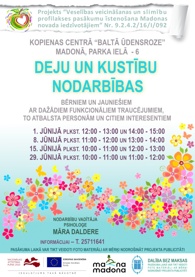 Projekta “Veselības veicināšanas un slimību profilakses pasākumu īstenošana Madonas novada iedzīvotājiem” Nr. 9.2.4.2/16/I/092 ietvaros bērni un jaunieši ar dažādiem funkcionāliem traucējumiem aicināti uz veselības veicināšanas deju un kustības nodarbībām.