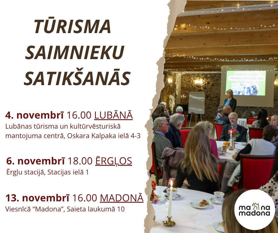 TŪRISMA saimniekus aicinām uz tikšanās vakariem - Lubānā, Ērgļos un Madonā